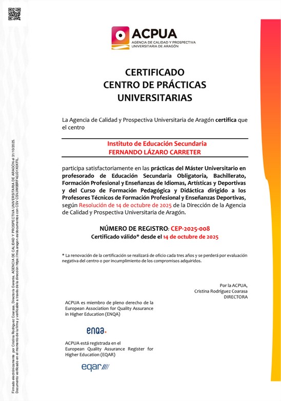 La Agencia de Calidad y Prospectiva Universitaria de Aragón, ACPUA, nos otorga el sello de calidad por la participación del centro en los programas de Máster Universitario.