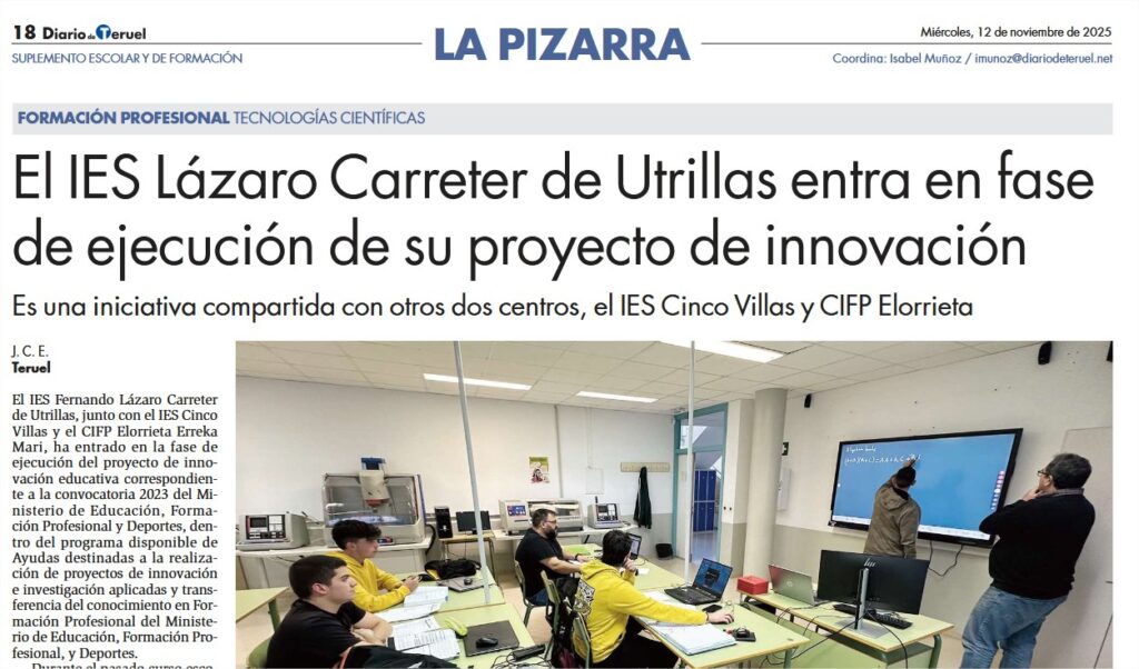 El IES Fernando Lázaro Carreter de Utrillas, junto con el IES Cinco Villas y el CIFP Elorrieta-Erreka Mari, ha iniciado la fase de ejecución de su proyecto de innovación educativa dentro de la convocatoria 2023 del Ministerio de Educación, Formación Profesional y Deportes. Esta iniciativa forma parte del programa nacional de ayudas a proyectos de innovación e investigación aplicadas y transferencia del conocimiento en Formación Profesional.